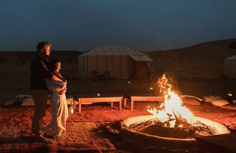 Wake early for the most unforgettable sunrise of your life. Climb the dunes and watch the world awaken together. Spend the day your way sandboard, visit nomadic families, or simply lie side by side in the sand, listening to the whispers of the wind. In the evening, share another camel ride at golden hour. Tonight, dance to the rhythm of Saharan drums beneath the starlit sky. This is your heartbeat. This is Morocco.